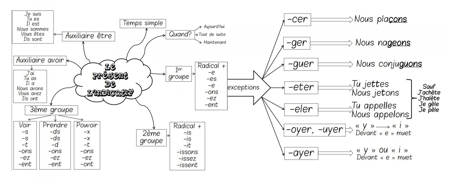 1er groupe en-er | 2e groupe en -ir | 3e groupe en -re, -oir, -ir | auxiliaires | |